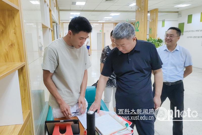 随后,来兴平一行检查了体育馆、图书馆、餐厅服务保障工作。他走进体育馆,详细询问体育馆开放时间、提供的运动项目,要求假期体育场馆要应开尽开,更好满足留校学生的体育锻炼需要。在正在改造提升的篮球场、排球场、新田径场,他仔细了解功能设置、施工进度,叮嘱相关部门要统筹好工程质量和施工进度,确保开学后各体育场馆和运动设施如期投用,并对提前谋划秋季学期师生校园体育文化活动提出明确要求。在图书馆,他与在馆学习的同学们亲切交流,询问备考研招考试学生的复习进度、报考院校。在得知来自安全学院的唐晓伟同学正在备考本校研究生,他鼓励该生要保持定力,继续努力,争取顺利“上岸”。检查中还偶遇了正在图书馆参观的来自宝鸡的报考电控学院电气工程及其自动化专业的2024级新生晁琰钊同学,他祝贺并欢迎该生加入西科大家庭,对该生提前进校了解学校表示肯定,祝愿该生能够逐梦西科、圆梦西科。在榴馨苑餐厅,他了解了食堂开放时间,逐一查看了各档口供应的菜品种类,要求后勤部门要尽量满足留校师生多样化的餐饮需求,确保菜品质量和食品安全。