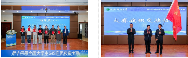 闭幕式最后进行了大赛交接仪式,第十五届全国大学生GIS应用技能大赛将于2026年在信阳师范大学举行。信阳师范大学地理科学学院院长颜俊介绍了学校情况,并向全体与会者发出热情邀请。