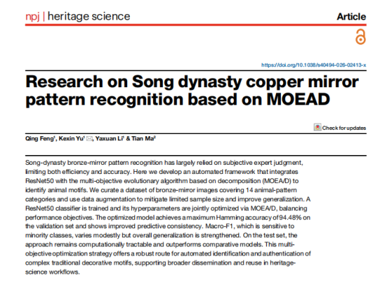 近日,艺术学院“文化遗产数字保护与智能设计协同创新团队”在国际顶级期刊《Nature》子刊《npj| Heritage Science》发表题为《Research on Song Dynasty Copper Mirror Pattern Recognition Based on MOEA/D》的研究论文。这是西安科技大学人文社科领域首次在该类型国际重要期刊发表研究成果,标志着学校在文化遗产数字保护的交叉学科研究领域实现重要突破,相关研究也为中华优秀传统文化的数字化传承与智能保护提供了全新的技术路径。