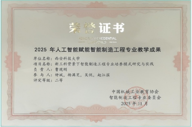 我校机械工程学院院长曹现刚教授主持的《新工科背景下智能制造工程专业培养模式研究与实践》项目荣获2025年人工智能赋能智能制造工程专业教学成果二等奖。同时,曹现刚教授增补为中国机械工业教育协会智能制造工程专业委员会(第一届)委员。