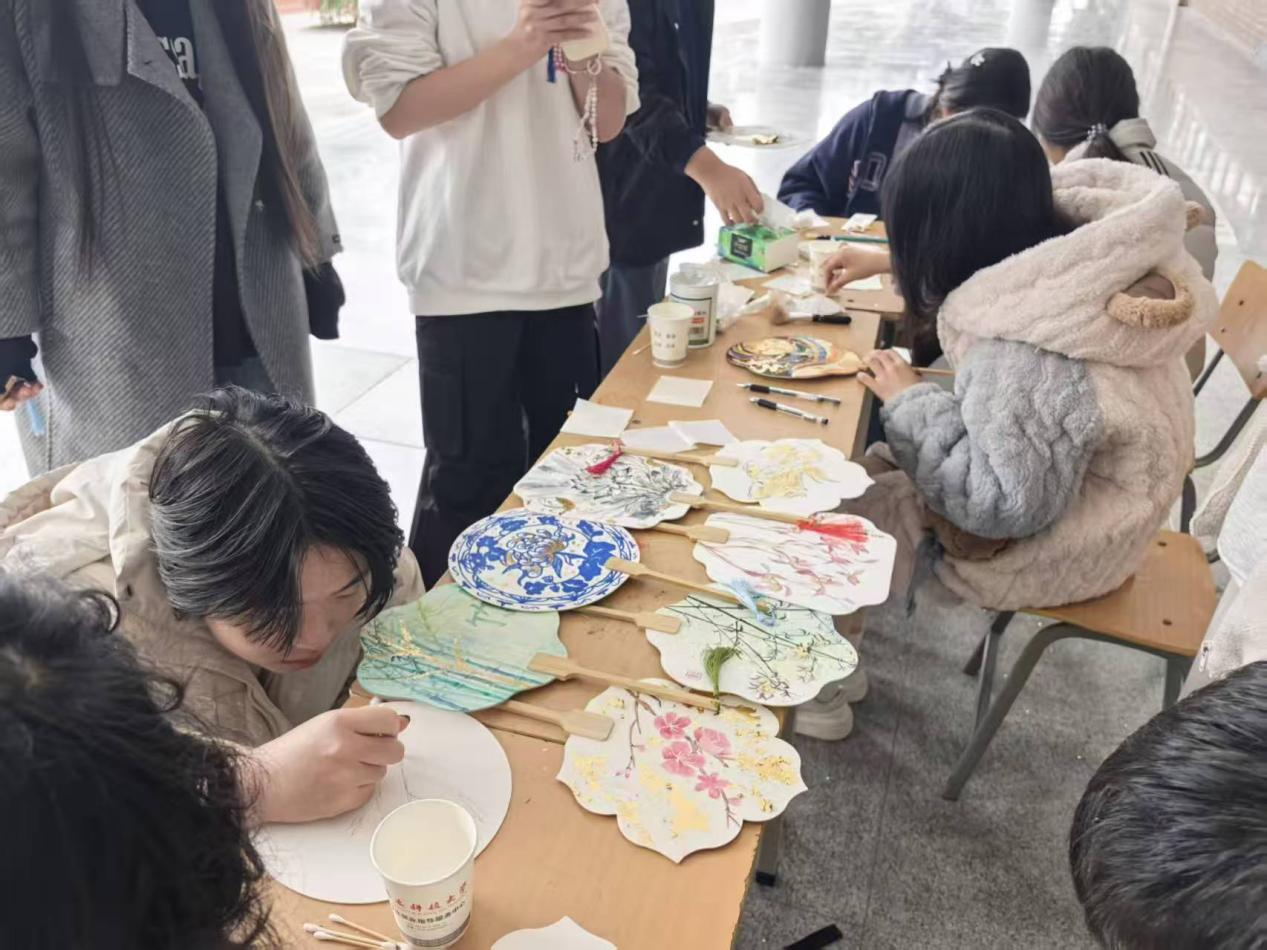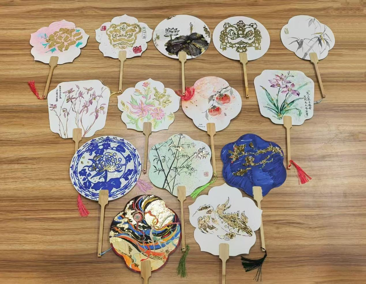 现场金箔闪光泽、扇面蕴雅致,同学们围坐交流,指尖起落间传递传统技艺。成品将金箔的精致与扇面的古典美学相融,每把扇子都承载着学生对传统工艺的理解,既是非遗技艺的鲜活实践,也是青春视角下传统文化的生动表达。