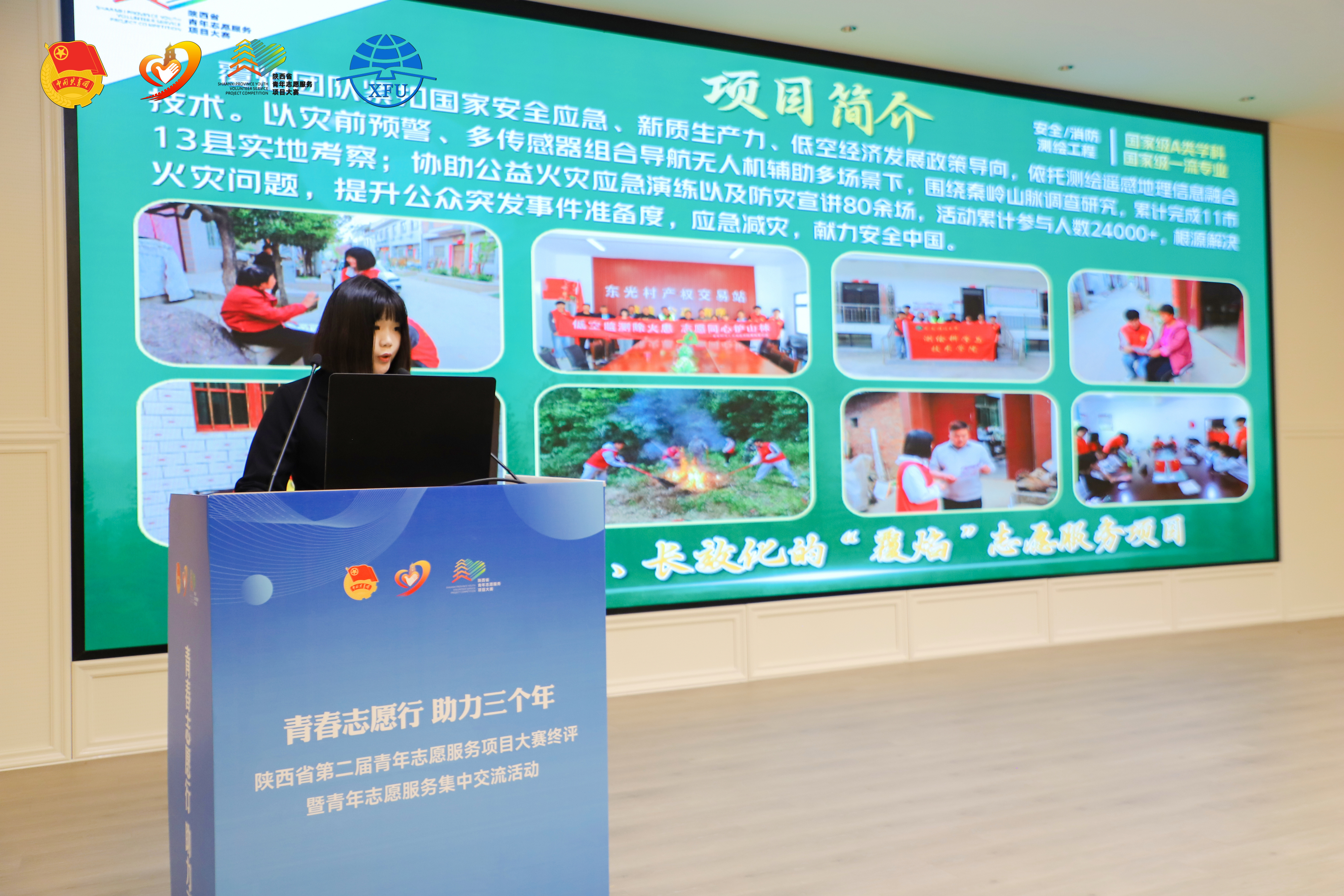 终评现场,我校参赛学生精神饱满、沉着自信,按照赛事流程依次完成项目展示与答辩环节。建筑与土木工程学院“沃土行动——高标准农田志愿服务项目”围绕高标准农田建设需求,讲述了学生志愿者走进农田乡间,指导开展给排水设备安装技术,助力农业生产提质增效的实践历程。电气与控制工程学院“职芽计划——为乡村留守儿童职业启蒙志愿服务项目”项目已经连续多年在临潼区、雁塔区的小学开展职业认知普及,通过趣味宣讲、实践体验等形式,帮助青少年树立正确职业观,合理规划成长路径。测绘科学与技术学院“防患未‘燃’——科技防火宣讲预警志愿服务项目”志愿者队利用无人机和遥感技术,对指定县域进行防火点排查,针对性开展防火宣传宣讲,筑牢县域消防安全防线。他们结合自身志愿服务实践,生动讲述项目背景、实施过程、服务成效与未来规划,用具体的数据、鲜活的案例,展现了项目在解决实际社会需求中的积极作用,传递出青年志愿者的志愿服务精神。
