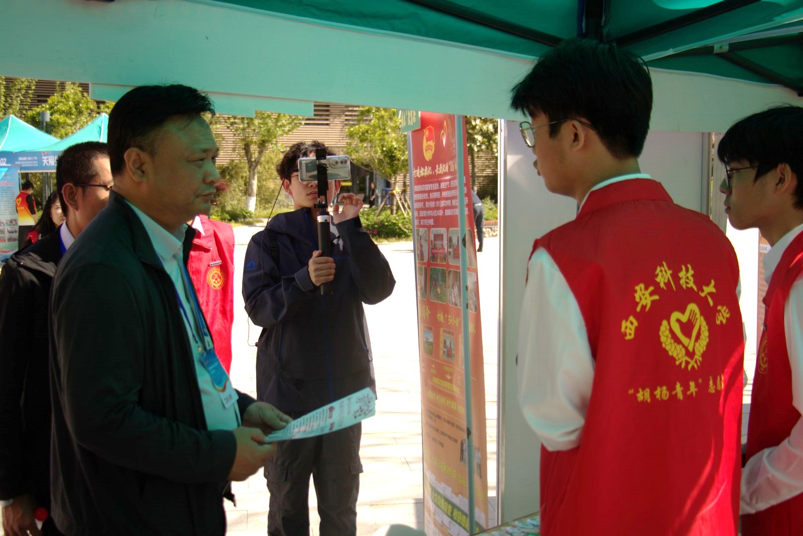 终评路演答辩期间,同步举办项目成果展,测绘科学与技术学院志愿者服务队在在西安翻译学院图书馆活动广场进行成果展示,推动各志愿服务项目互学互鉴。团省委青社部部长吴闯了解了项目主要内容,并给予了优化志愿服务工作的建议。